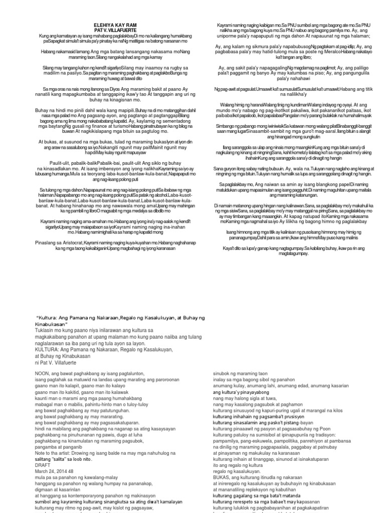 Tradisyon at kaugalian elehiya para kay ram. Villafuerte Ram Elehiya para kay Ram Kung ang kamatayan ay isang mahabang paglalakbay Di mo na kailangang humakbang pa Sapagkat simulat simula pay pinatay ka na Ng matitigas na batong naraanan mo. 622017 Filipino 9 Elemento ng Elehiya 1.