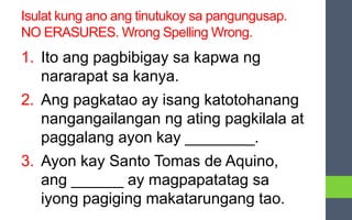Ano ang kahulugan ng katarungan aoyn kay sto.tomas de aquino. Pages 5 This preview shows page 3 - 4 out of 5 pages. Ang prinsipyo ng proportio ni Tomas De Aquino ay pagkakaroon ng pantay na distribusyon batay sa pangangailangan ng indibidwal at batay sa kakayahan lumahok nito sa produksyon. Course Title ECON 400.