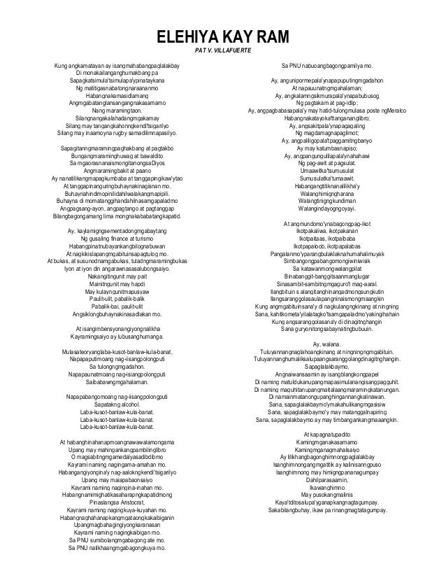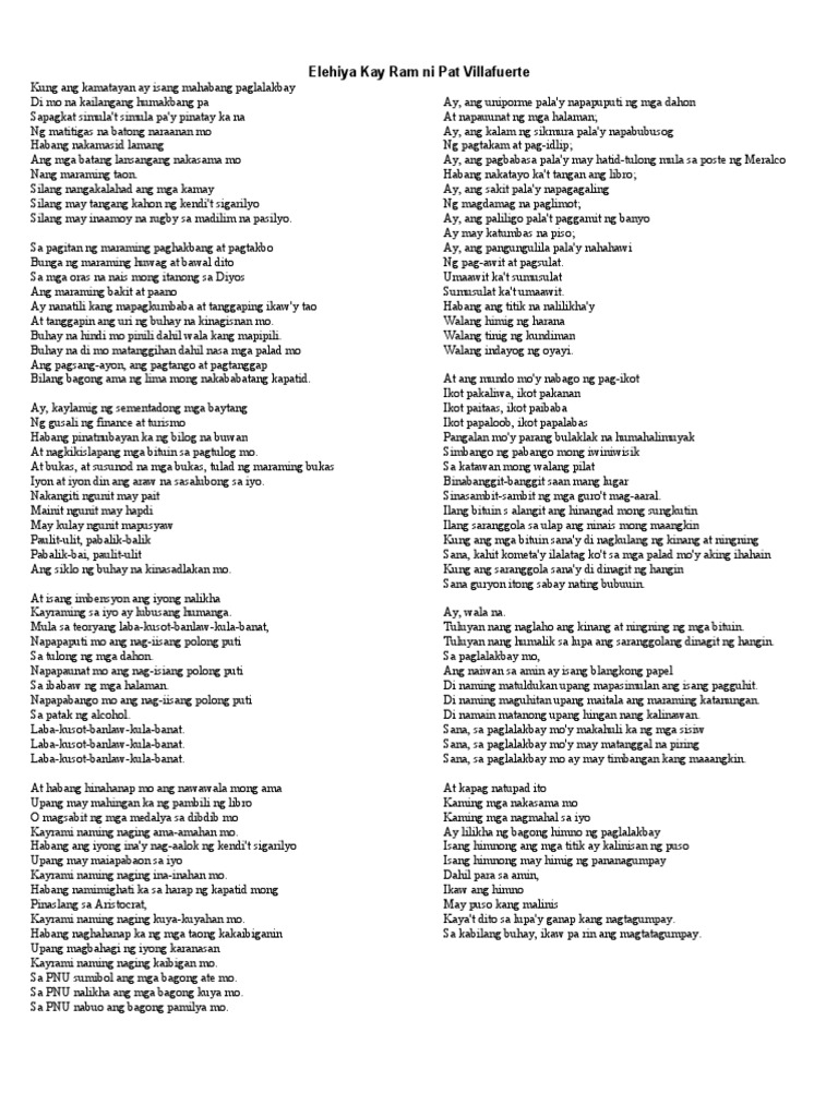 Sinulat niya ang elehiya para kay ram. Elehiya para kay Ram ni Pat vVillafuerte Kung ang kamatayan ay isang mahabang paglalakbay Di mo na kailangang humakbang pa Sapagkat simulat simula pay pinatay ka na Ng matitigas na batong naraan mo Habang nakamasid lamang Silang nangakalahad ang mga kamay Silang may tangang kahon ng kendit sigarilyo Silang may inaamoy na rugby sa. Elehiya Para Kay Ram ni Pat V.