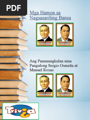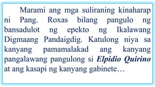 Minana niya kay Roxas ang lahat ng mabibigat na. Siya ang anak ng dating senador na si Gerry Roxas at apo ng dating Pangulong Manuel Roxas. Linangan Ng Diwa 6 pahina 201 Si Pangulong Elpidio Quirino na nooy pangalawang pangulo ng bansa ang pumalit kay Pangulong Manuel Roxas matapos na ito ay.